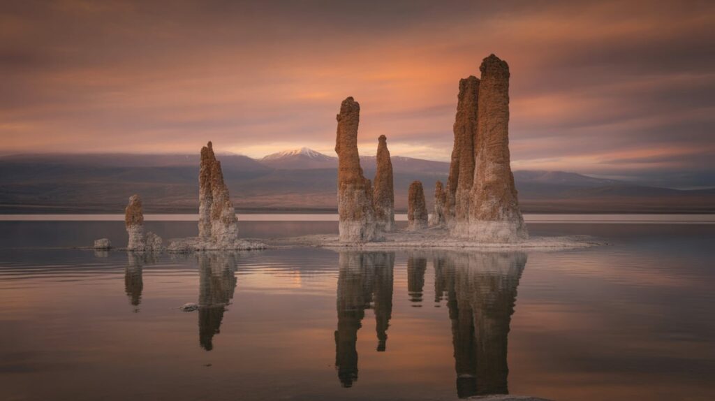 For photo planning, shoot both wide and tight: wide frames show the strange shoreline, while tighter crops turn tufa into abstract forms. Calm water gives reflections; wind gives texture—both can work, so decide your visual goal before you arrive. A slightly warm edit can make the scene feel timeless, but keep it subtle so the rock still reads as mineral. (Space)