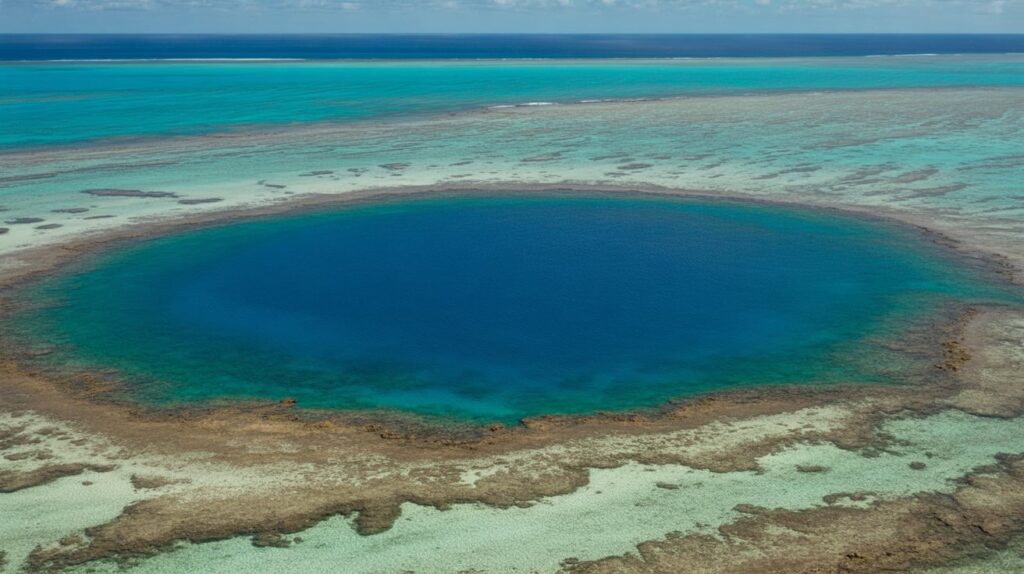Map pin: Lighthouse Reef, Belize. The Great Blue Hole looks unreal because it’s a near-perfect dark circle cut into bright reef waters. The classic photo is aerial: center the circle, then let the reef’s lighter blues form a natural frame. If you can’t get aerial, plan a boat-level story: reef edge, open water, then divers entering.