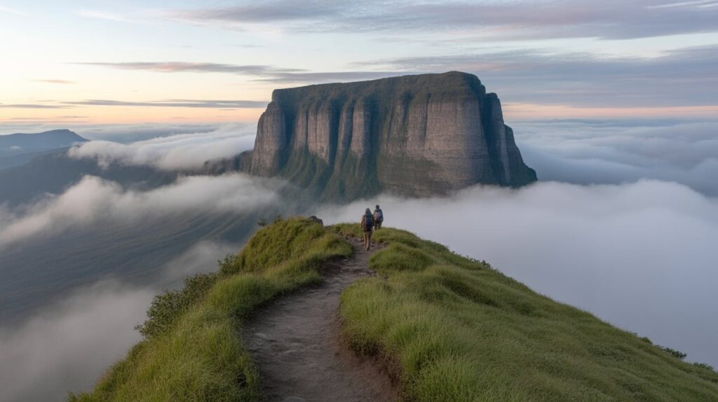 For photo planning, prioritize vantage points that show the flat summit silhouette and the vertical cliff face in one frame. Use a telephoto option to compress clouds against the cliff for a floating effect. Edit for atmosphere: slightly lifted shadows and controlled highlights preserve the mist without losing rock texture. This pin works well with notes on trek timing and seasonal cloud patterns. (UNESCO World Heritage Centre)