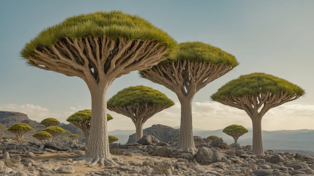 Map pin: Socotra Archipelago, Yemen. Socotra looks unreal because the plant shapes feel invented—especially the dragon blood trees with their umbrella silhouettes. Plan images like a botanical landscape: single trees as heroes, then wider shots that show clusters across rocky plateaus. The “other planet” effect improves when you keep the horizon simple and avoid modern elements.