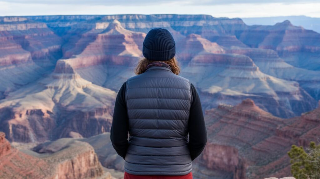 Checklist: long-sleeve thermal top, puffer vest or lightweight insulated jacket, straight-leg hiking pants or lined leggings, and closed-toe sneakers or hikers. Add a beanie or ear warmer for windy overlooks and thin gloves if your hands get cold easily. Use a crossbody bag that zips shut. Choose darker neutrals (black, navy, charcoal) so canyon colors stand out. Keep lip balm and hand cream in a pocket for dry air and gusty conditions.