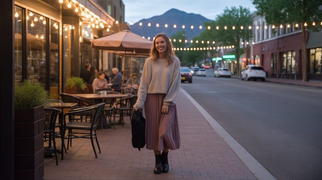 Northern Arizona evenings can feel cool, especially in Flagstaff where elevation changes everything. This dinner outfit is warm enough for patio seating and still polished for photos under string lights. The look is simple: one cozy knit plus a flattering bottom that moves comfortably. It’s ideal after a day of hiking or sightseeing when you want to look refreshed without overpacking. Focus on layers and closed-toe shoes so you can walk around town comfortably.