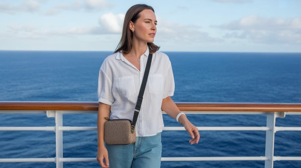 Pack a compact crossbody or belt bag that zips shut. It should fit your phone, cruise card, lip balm, and a small sunscreen. If you plan to shop in ports, add a foldable tote inside. Choose a neutral color that matches your outfits and won’t show scuffs. This bag becomes your “daily driver” and saves you from constantly returning to your cabin for small items. It’s one of the highest-use items on a cruise.