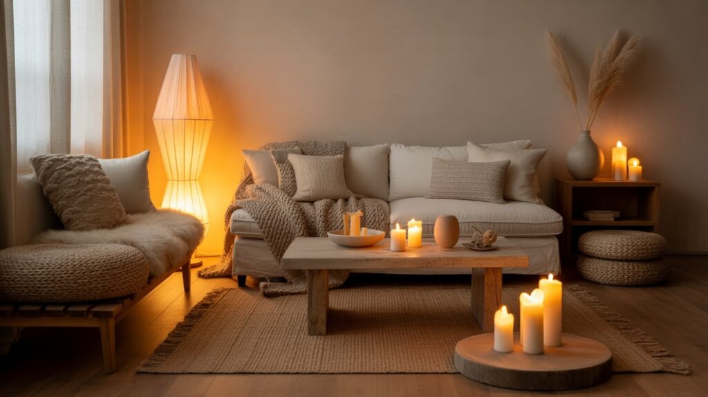 Swap harsh overhead light for warm lamps, candles, or soft string lights. Add one extra layer: a throw blanket, a textured pillow, or a rug. Small changes shift the entire feel of a room. Winter homes feel better when the lighting is gentle.