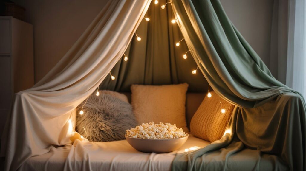 Pick one movie theme—classic winter, comedy, or comfort nostalgia—and build a small fort with blankets and pillows. The goal is to change the room, even if only for one night. Add a snack bowl and a warm drink so you don’t have to get up mid-movie. Cozy is better when it’s uninterrupted.