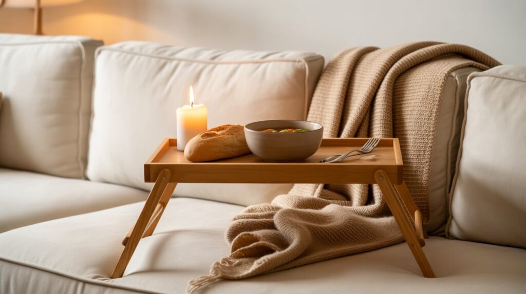 Turn dinner into a cozy moment by serving it on a tray. Add a candle or soft light and a simple drink. This works even if your meal is basic. The tray makes it feel special and intentional, like you’re taking care of yourself.