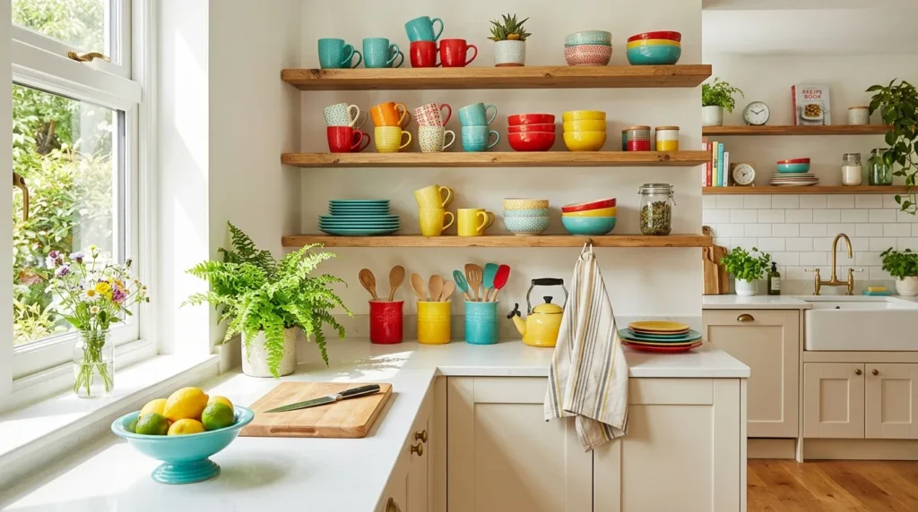 Colorful kitchenware is an easy way to make your kitchen feel more lively and full of personality. Bright mugs, bowls, and plates in summer shades like yellow, red, and turquoise can instantly wake up open shelves, countertops, or dining spaces. Even a small collection can make the room feel more cheerful.
