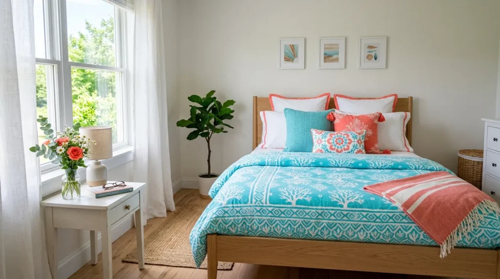 Bright bedding is one of the easiest ways to give your bedroom a fresh summer update. Shades like turquoise, coral, and crisp white instantly make the bed feel lighter, brighter, and more inviting. I’ve seen how swapping out darker or heavier bedding can completely lift the mood of a room without changing anything else.
