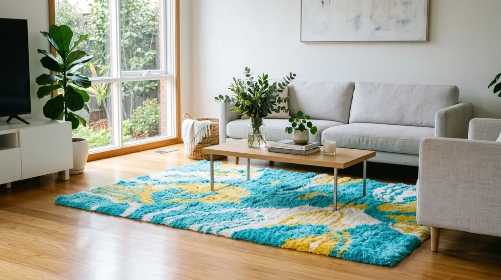 A bright area rug can completely change the look and feel of a room by bringing color, softness, and structure into the space. It helps define a seating area, anchor furniture, and add visual interest without needing to fill the room with extra decor. In summer, vibrant shades like turquoise, yellow, or coral can make the room feel more open and cheerful.