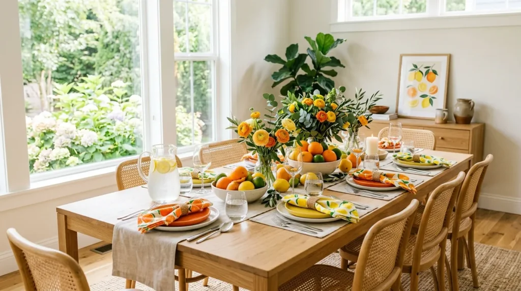 I’ve found that citrus decor works especially well in kitchens and dining rooms because it feels fresh and lively without being complicated. Even something as simple as a bowl of lemons on a table or citrus-toned napkins can create a noticeable seasonal update that feels natural and bright.