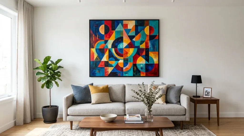Bold wall art is a powerful way to brighten a room without changing the furniture or layout. A large colorful piece can instantly shift the energy of the space and make the room feel more expressive and finished. In homes with neutral walls or simple furniture, bold art creates contrast and keeps the design from feeling flat.