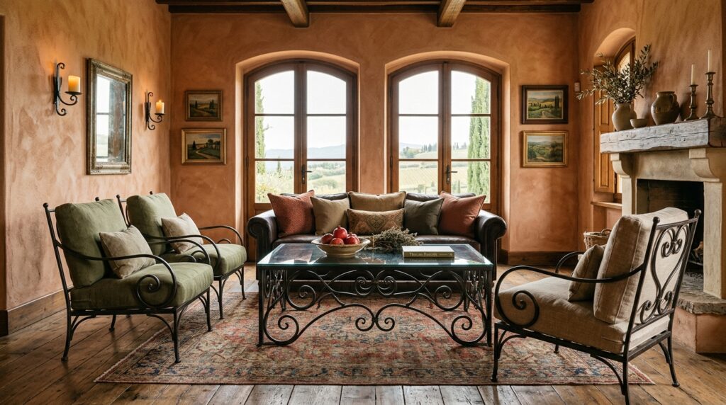 Iron-clad furniture brings a strong and timeless presence to Tuscan interiors. Pieces with iron frames or decorative ironwork instantly add structure and old-world character, especially when balanced with softer materials like wood, linen, and muted upholstery. The contrast between dark iron and warm earthy tones gives the room depth and visual interest.