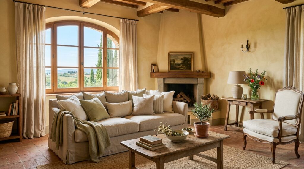 I’ve found that linen is especially effective in Tuscan-inspired interiors because it keeps the room from feeling too dark or formal. The natural texture adds depth, while the muted colors keep everything balanced. It is one of those details that quietly makes the room feel more refined and more livable at the same time.