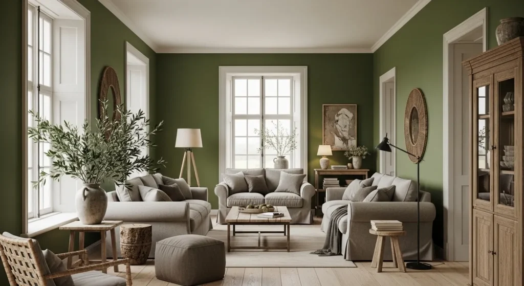 I’ve found that olive green looks especially elegant with warm woods, creamy whites, and textured fabrics. It gives the room more character than a plain neutral wall while still staying timeless and easy to live with. If you want a space that feels earthy, elegant, and connected to nature, this is a strong choice.