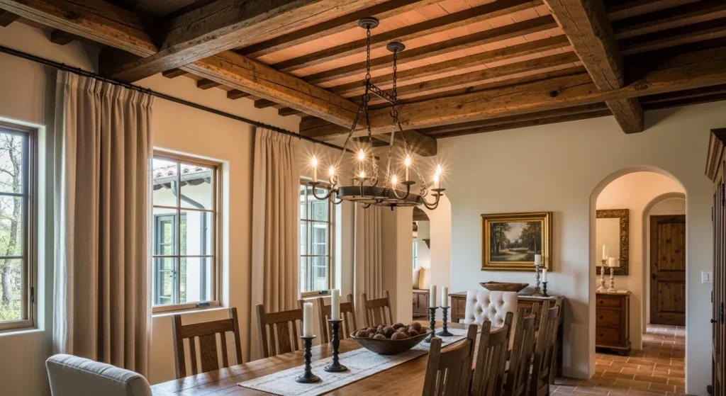 Even when the rest of the room is simple, ceiling beams add a strong visual element that gives the design more substance. I’ve seen them work beautifully with plaster walls, iron lighting, and rustic furniture. They help the space feel elevated while still staying warm and livable.