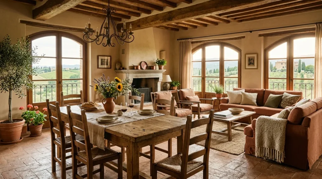 A Tuscan-style living room featuring rustic wooden furniture, including a large, weathered dining table and chairs with a natural wood finish. The furniture is paired with soft, earthy tones like terracotta cushions and woven throws. Soft, warm light filters through large windows, casting a cozy glow over the room. The flooring consists of textured terracotta tiles, while a few potted plants bring a touch of greenery. The entire space feels earthy, welcoming, and grounded, reflecting the warmth and timeless appeal of Tuscan design.