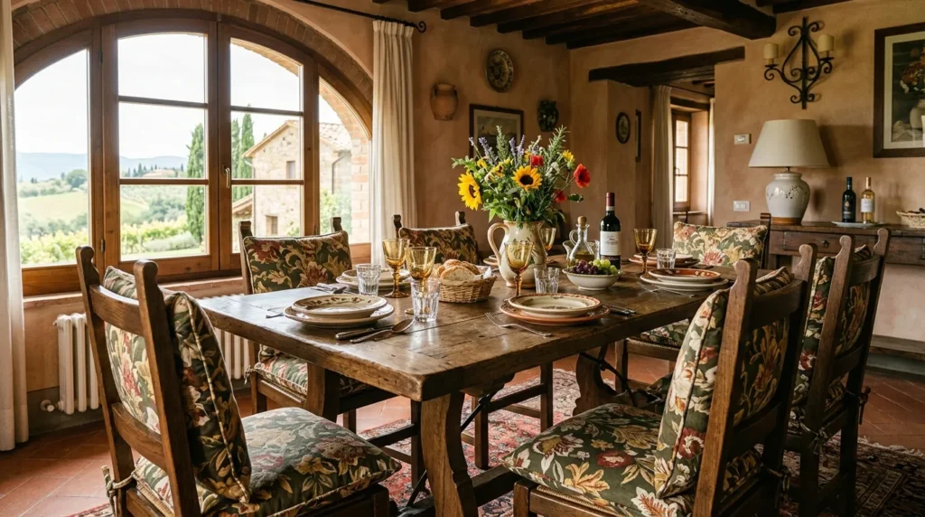 A Tuscan dining room with floral-patterned fabric used in the cushions of chairs around a wooden dining table. The floral patterns feature earthy tones like olive green, deep red, and mustard yellow, reflecting the colors of the Tuscan countryside. The table is set with rustic ceramics and vintage glassware, creating a warm, inviting atmosphere. The natural light filtering in from nearby windows highlights the textures of the fabric and the wooden table, enhancing the room’s rustic elegance and connection to nature.