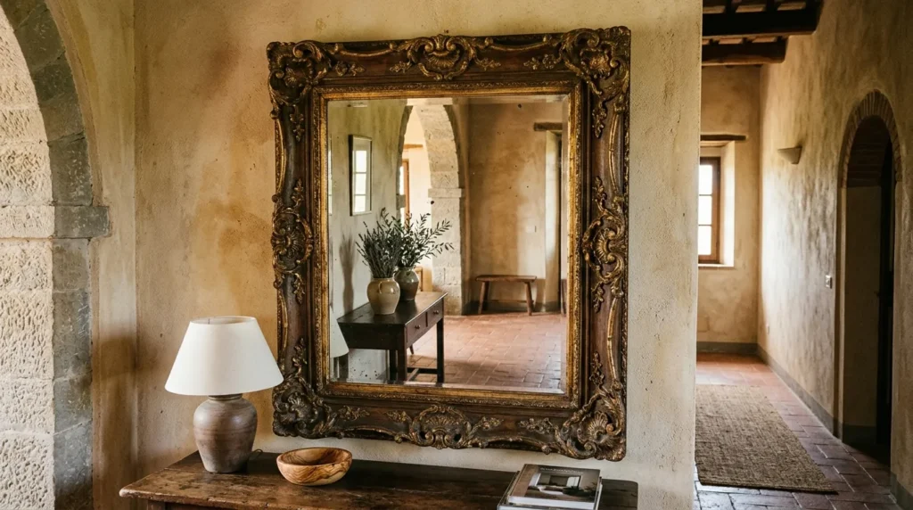 I’ve found that mirrors like this work especially well above dressers, fireplaces, or console tables where they can become part of the room’s main visual story. They bring sophistication without feeling too polished, which is exactly what Tuscan design does best.