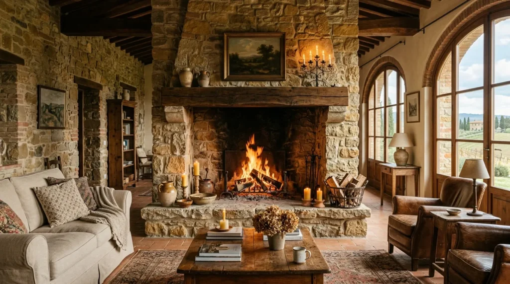 A stone fireplace instantly brings depth, warmth, and old-world beauty into a Tuscan-style home. Even in a bedroom suite or adjacent sitting area, it can make the space feel luxurious and comforting at the same time. The natural texture of stone works beautifully with wood beams, terracotta floors, and soft neutral walls.