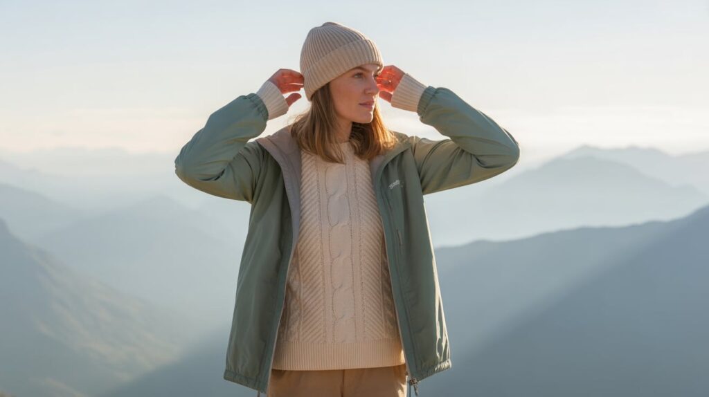 A matching knit set is a great travel hack because it looks styled with zero effort. Add a packable jacket so you can handle wind at viewpoints and still stay comfortable. A beanie ties it all together and adds the mountain vibe that looks great in trail photos.