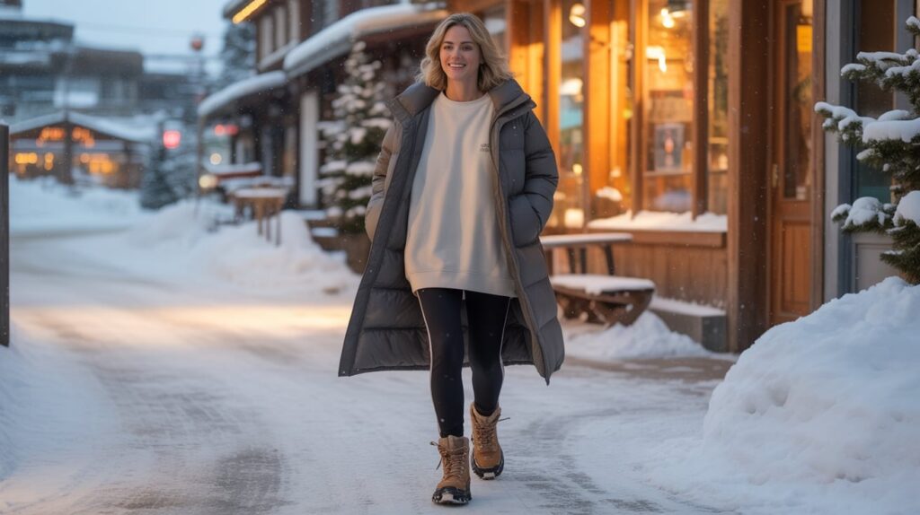 For trail photos, this outfit looks clean and sporty, especially in neutral tones that contrast with snow and trees. Unzip the puffer for pictures so the layers show. Add gloves and a beanie for a true mountain vibe, and you’ll look put-together even after a long walk.