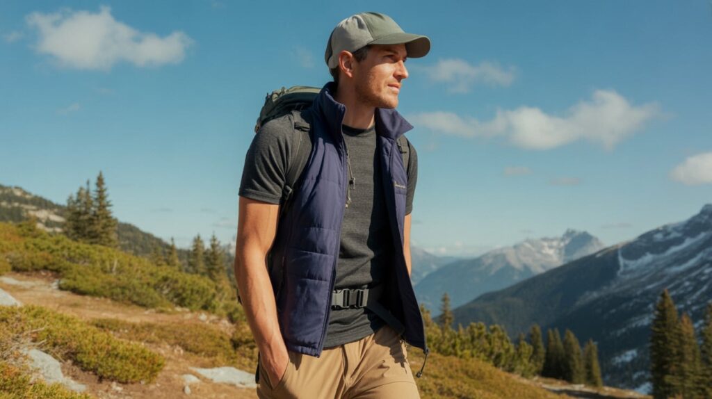 12) Merino Tee + Fleece Vest + Hiking Pants + Cap
