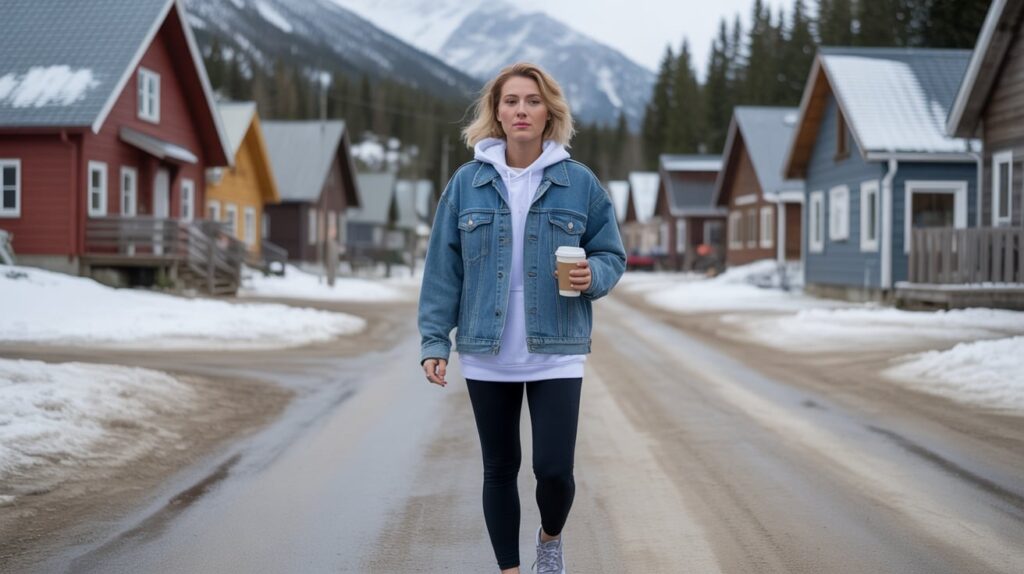 A denim jacket layered over a hoodie gives a casual, travel-day look that feels perfect for cabins and quick photo stops. Leggings keep it comfortable for walking, and sneakers work for dry paths and town streets. It’s not for deep snow, but it’s great for mild days.