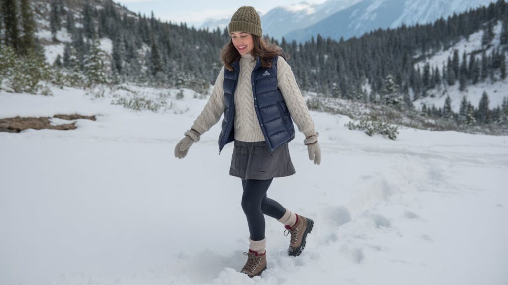 For photos, the skirt adds movement and looks great in wide shots. Keep the sweater simple so the skirt stands out. Choose trail boots for grip and stability. This outfit is best for dry trails or packed-snow paths where you want something practical but still a little different.