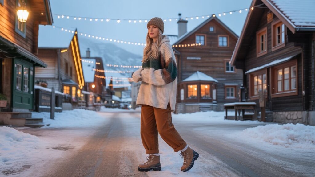 For photos, corduroy catches light nicely and looks great against snow. Choose earthy colors like tan, rust, or olive. This outfit feels like a real mountain trip uniform and works well for dinner later without needing a full change.