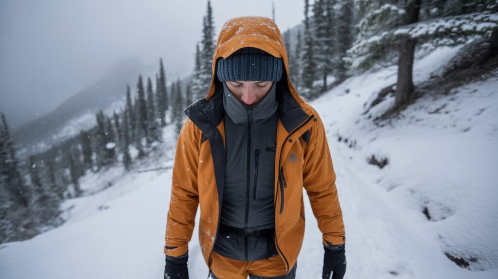 When weather is unpredictable, a waterproof shell is the smartest top layer. A matching base layer set underneath keeps you warm and looks coordinated if you remove the shell for photos. Beanie and gloves complete the winter-ready look and protect you when the trail gets cold.