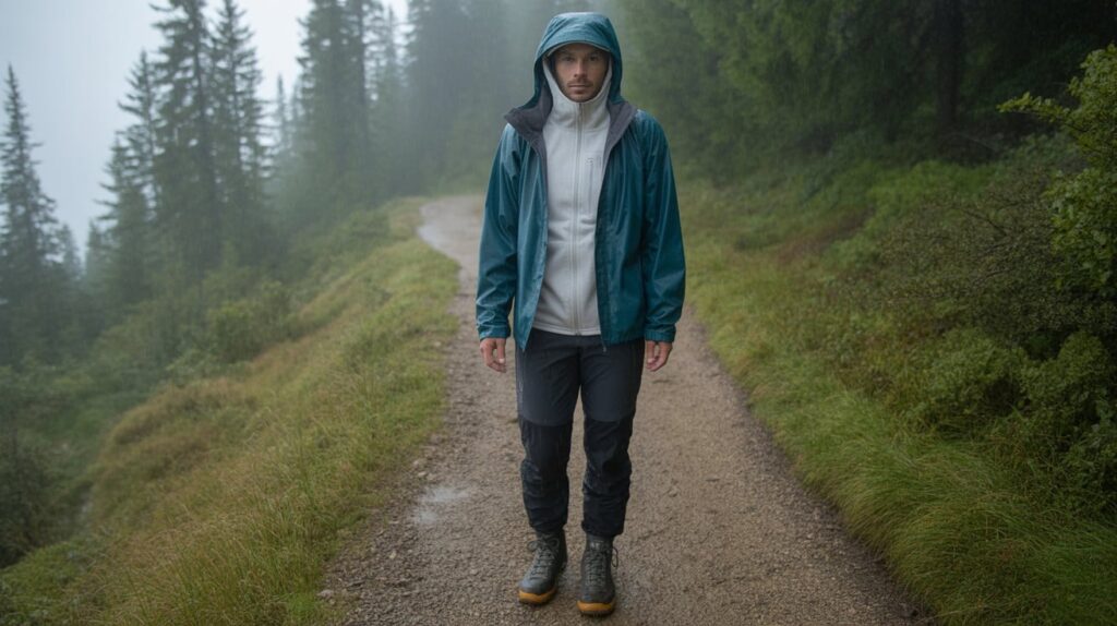 For photos, misty trails look magical, and this outfit fits the mood. Keep layers in dark or earthy tones so water spots don’t show. This setup is practical and looks like a real mountain traveler’s outfit, not a staged one.
